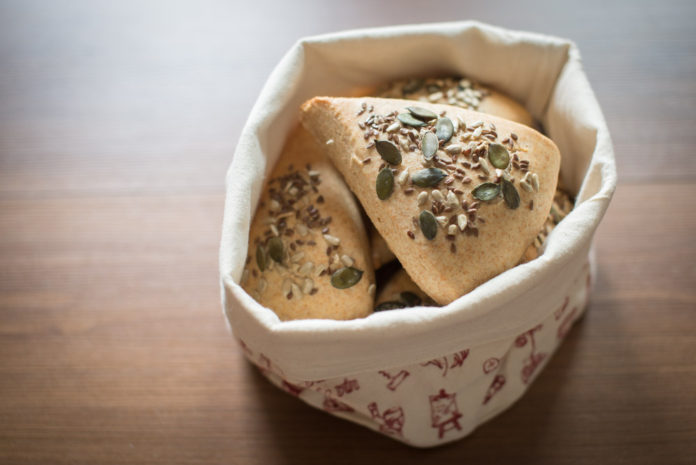 Den Teig mehrmals falten und zu einer Kugel formen. Den Teig auf etwa 20 cm Durchmesser rund ausrollen und mit einer Teigkarte/Messer in 8 Tortenstücke teilen. Die Teigstücke auf ein Backblech mit Backpapier setzen und bei 50 Grad Ober-/Unterhitze für 15 Minuten zum gehen in den Ofen schieben. Anschließend mit Wasser besprühen, mit den Körnern bestreuen (leicht andrücken) und für etwa 20 Minuten bei 220 Grad Ober-/Unterhitze backen.